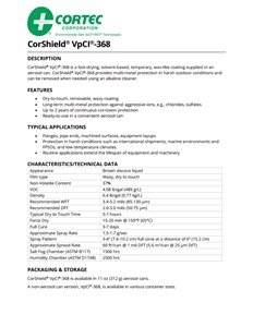 Description: CorShield® VpCI®-368 is a fast-drying, solvent-based, temporary, wax-like coating supplied in an aerosol can. CorShield® VpCI®-368 provides multi-metal protection in harsh outdoor conditions and can be removed when needed using an alkaline cleaner.