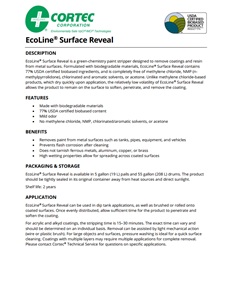 Description: EcoLine® Surface Reveal is a green-chemistry paint stripper designed to remove coatings and resin from metal surfaces. Formulated with biodegradable materials, EcoLine® Surface Reveal contains 77% USDA certified biobased ingredients, and is completely free of methylene chloride, NMP (n-methylpyrrolidone), chlorinated and aromatic solvents, or acetone. Unlike methylene chloride-based products, which dry quickly upon application, the relatively low volatility of EcoLine® Surface Reveal allows the product to remain on the surface to soften, penetrate, and remove the coating.