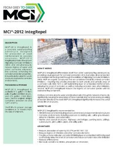 Description: MCI®-2012 IntegRepel is a concrete waterproofing admixture designed for protection of steel reinforcement in concrete structures. MCI®-2012 IntegRepel contains time proven Migrating Corrosion Inhibitors (MCI) and simultaneously reduces ingress of water and other corrosive elements into concrete, enhancing the corrosion protection properties. It is particularly suited for use in structures exposed to corrosive environments.